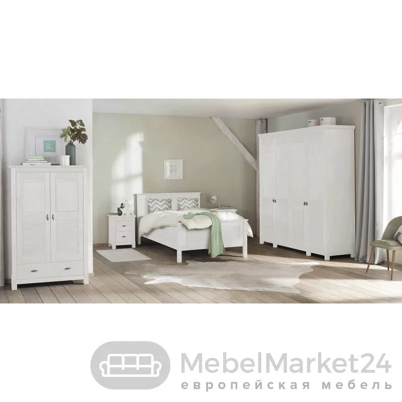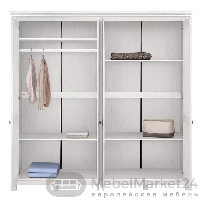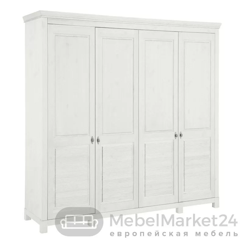 Это большой четырехдверный шкаф для внушительного гардероба! Внутри широкое отделение со штангой и местом под головные уборы, а также четыре вместительные полки для других вещей. Распашные двери – глухие, но с оригинальным декором. Завершает картину эффектная фурнитура “под старину”.
